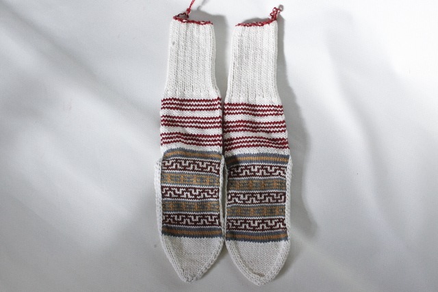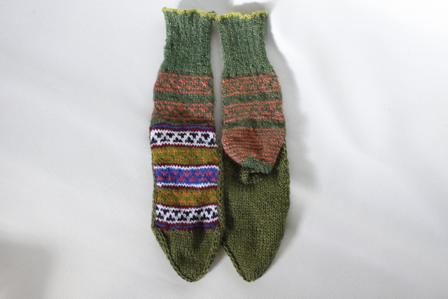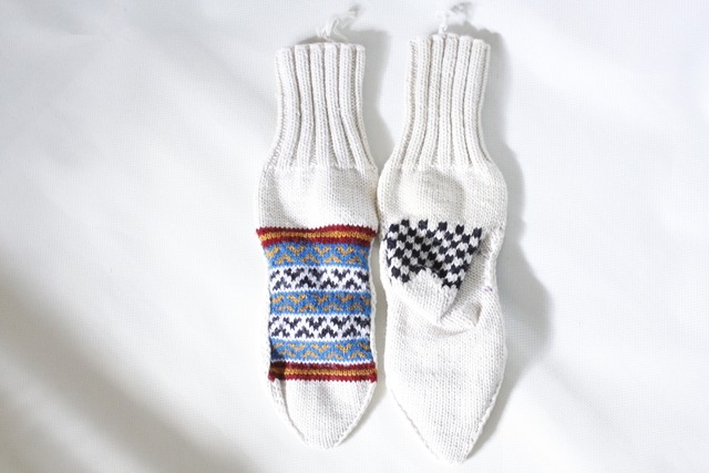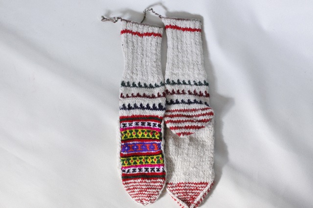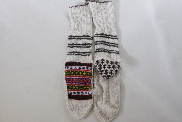 インド北部ヒマラヤの村の女性たちによって作られた手編みの靴下です。 標高2,000mの位置にある村々では寒い季節に備えて 女性たちが家の庭や広場で編み物をする光景を目にします。 とにかく温かく、外履きはもちろんですが ルームソックスとしても可愛いく重宝します。 素材はウールベースとアクリルベースのものが2種類あり ウールタイプは素朴なかわいらしさがあり、 丈夫なアクリルタイプはキャンプやアウトドアにもぴったりで これからの季節ガンガン活躍してくれそうです。 こちらはウールの中でもヨーロッパ・オーストリア産の 柔らかなウールを使用しているため履き心地・滑らかさともに抜群です。 左右違ったものを履く 自称“カタカタ履き”も とても愛おしくおすすめですよ。 ご夫婦やご家族での“ペア履き”もこれもまた良し。 サイズ :約21-26cm 素材 :ヨーロッパウールウール&アクリル(カラーステッチ部分) 原産国:インド ------------------------------------------ ◇サイズについて◇ 一つ一つ違いますが汎用性の効くサイズ感です ◇素材について◇ ウール&アクリル タイプ アクリル タイプの2種類です ※色糸はアクリル、無地はウール糸を使用しています ◇その他ご購入に関して◇ ●手作り製品のため、サイズ又模様が若干相違しておりますので予めご了承ください。 ●靴下上部に留めている紐が付いている場合があり、これはほつれ糸ではなく靴下を結ぶための糸です 糸を切る場合は糸の根元を結ぶ処理をした上で切ってください。(ほつれてしまう場合があります) ●靴下は現地の雰囲気をできるだけそのまま伝えるために日本向けにアレンジせず、そのまま輸入販売しております。 日本での工場生産品とは違いますのでご了承いただき、現地ならではの風合いや手仕事をご理解いただけますと幸いです。