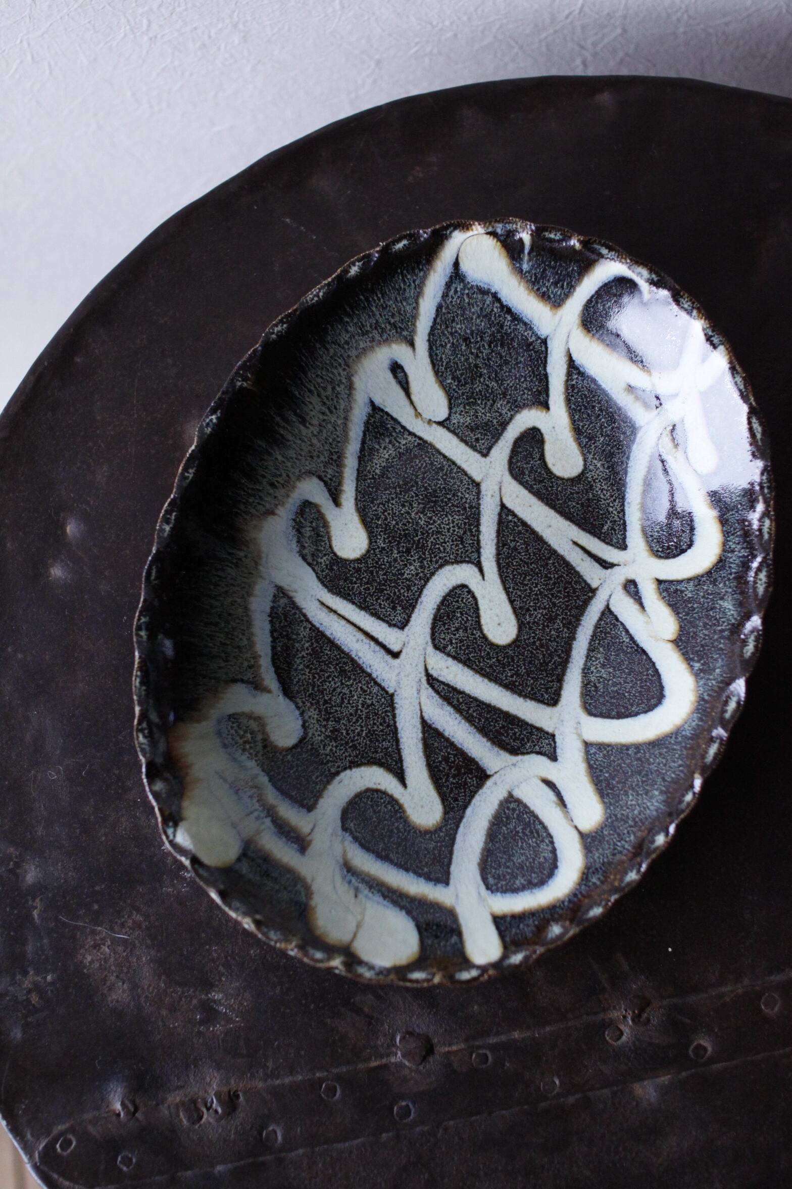【沙器窯・柳瀬俊一郎】 楕円カレー皿 糠青 跳ね波 ♯074 スリップウェア