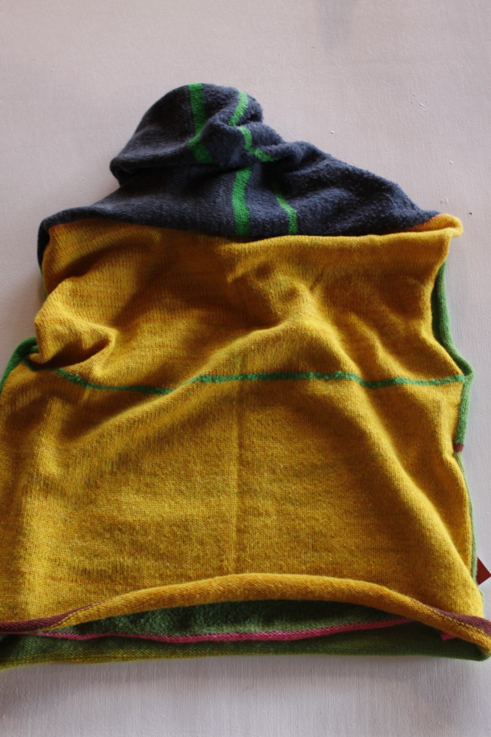 特にこのベストは身ごろの左右の重ね方で印象が変わったり上下反転することも可能です。