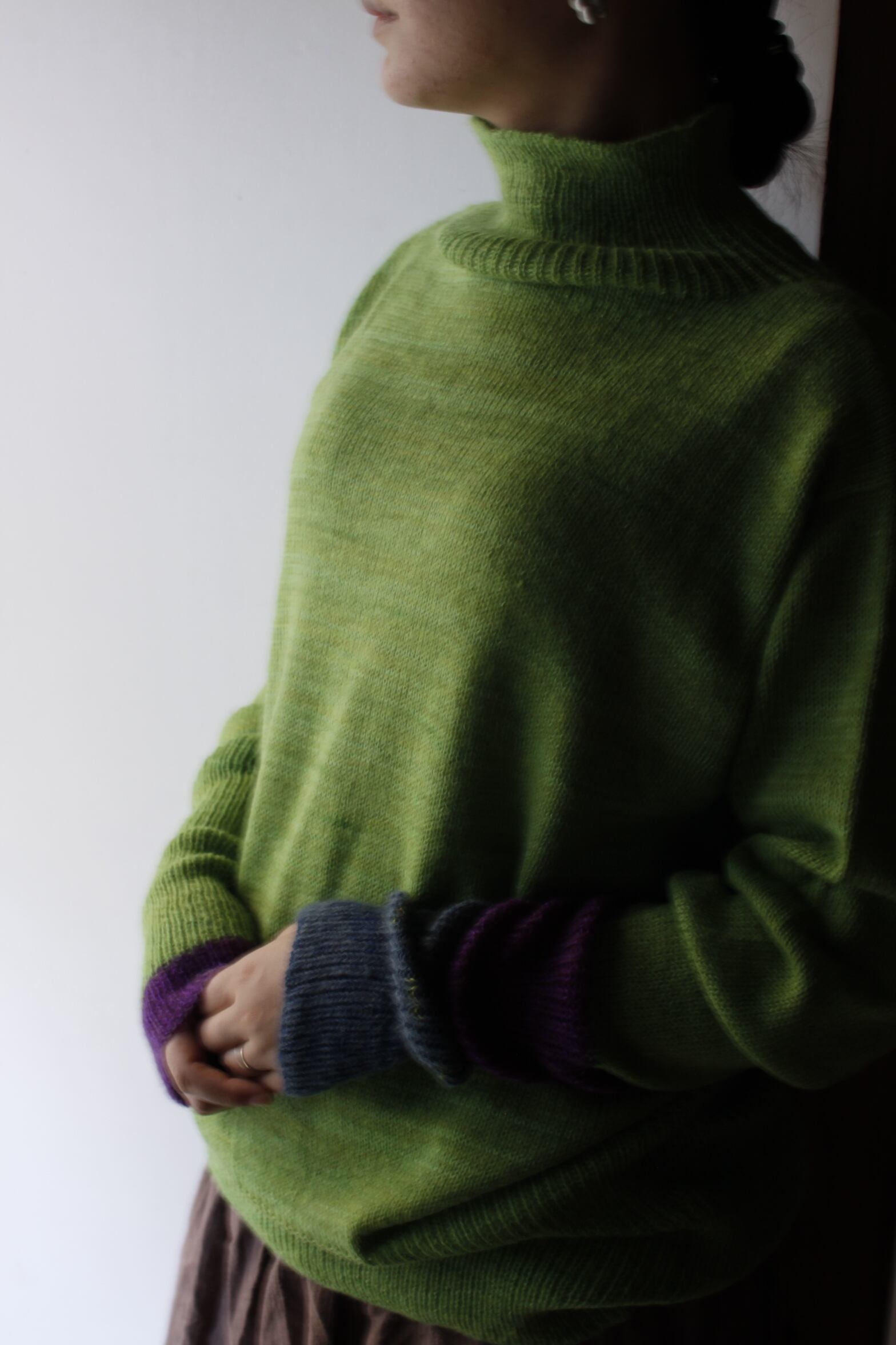 シンプルなパターンにみえますが、絶妙な袖と丈感、身幅のゆとりに対しての編みのテンションのかけ方など、40年間の編み物の経験が静かに落とし込まれている特別なニットです。
