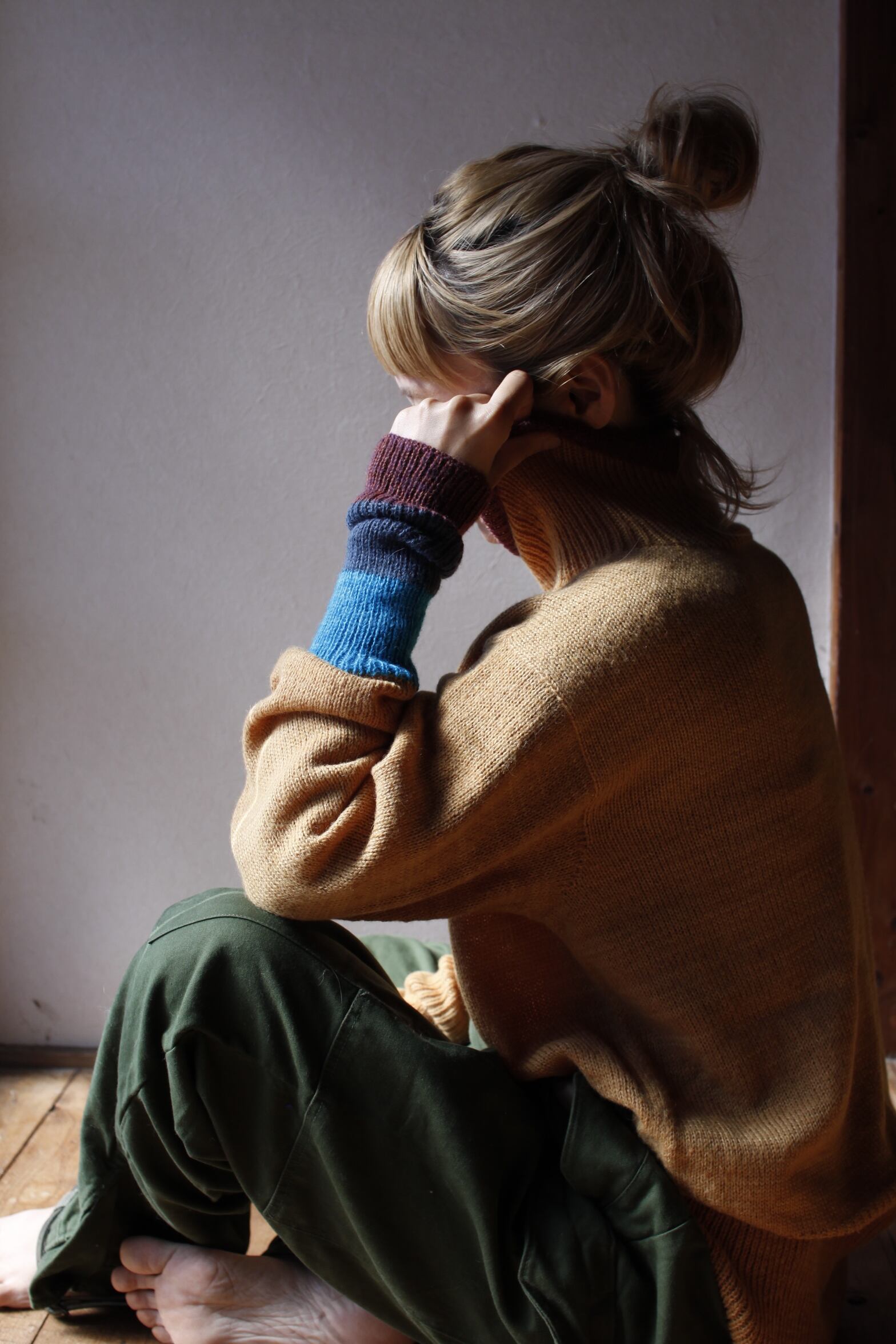シンプルなパターンにみえますが、絶妙な袖と丈感、身幅のゆとりに対しての編みのテンションのかけ方など、40年間の編み物の経験が静かに落とし込まれている特別なニットです。